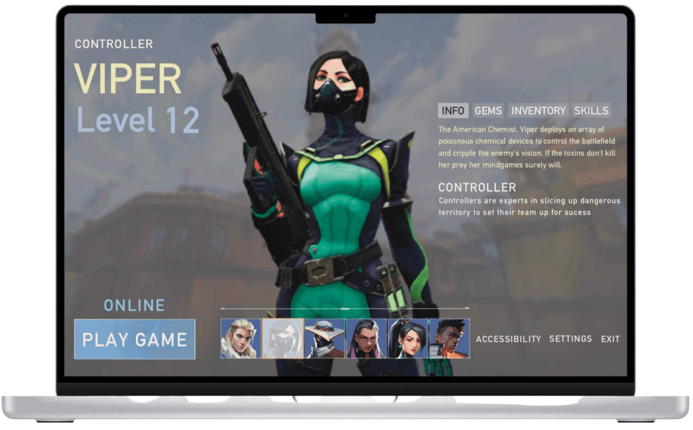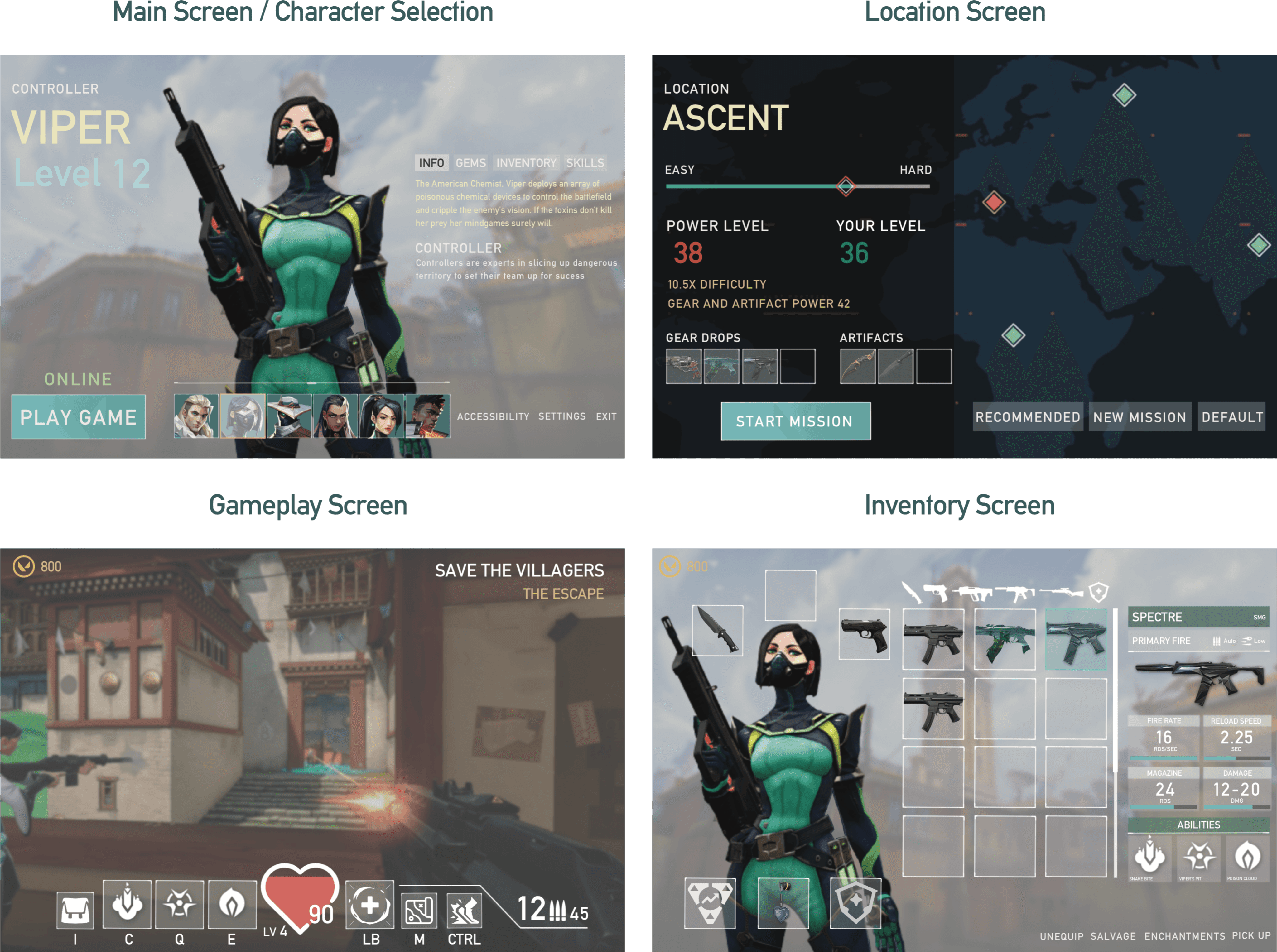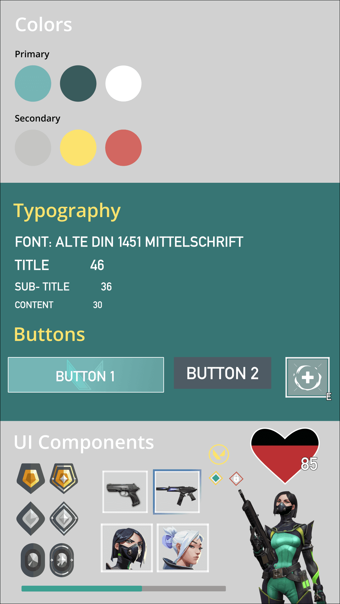 As a requirement by the course, the challenge was to apply a different UI style. I chose Riot's Valorant due to its unique stylization and flair. Using a mood board , I analyzed fonts, color scheme, and clean UI elements.