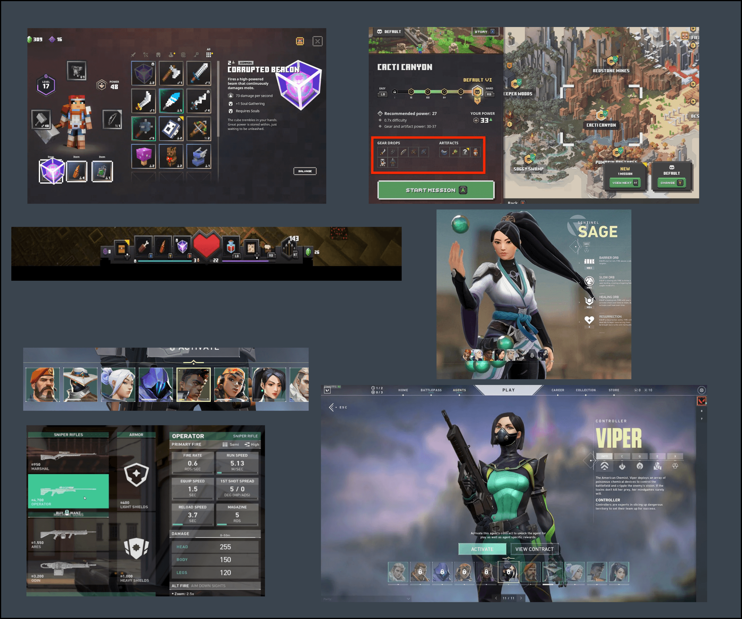 The updated mockups showcase the application of Valorant's UI and brand onto the Minecraft Dungeons gameplay screens.