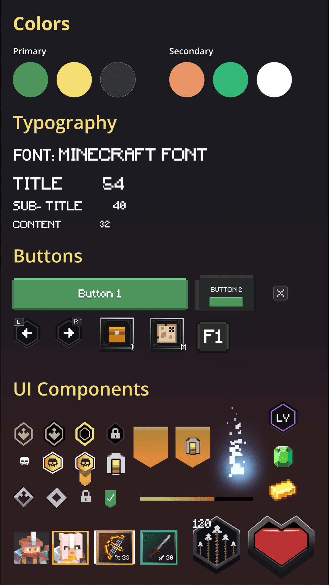 I started off a with Minecraft Dungeons UI and brand style, recreating the game's icons, typography, and colour palette to build a Brand Style Guide. This ensured future the redesign would have visual consistency.