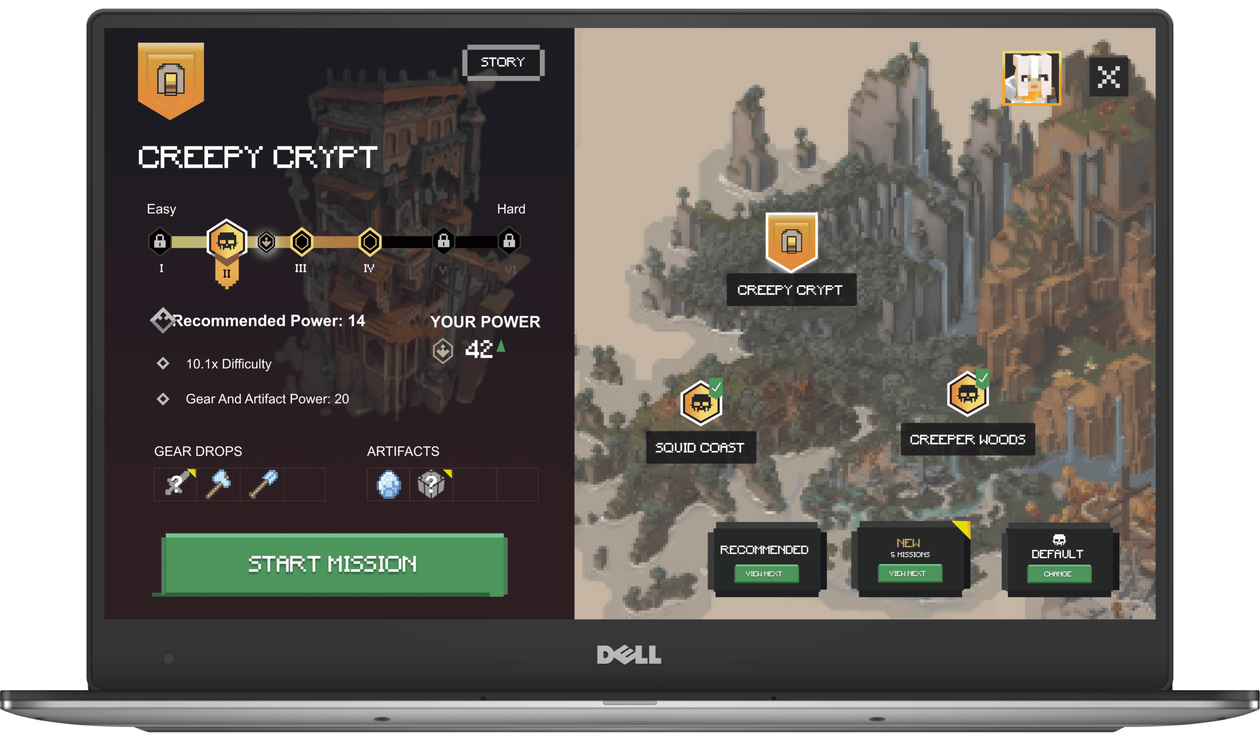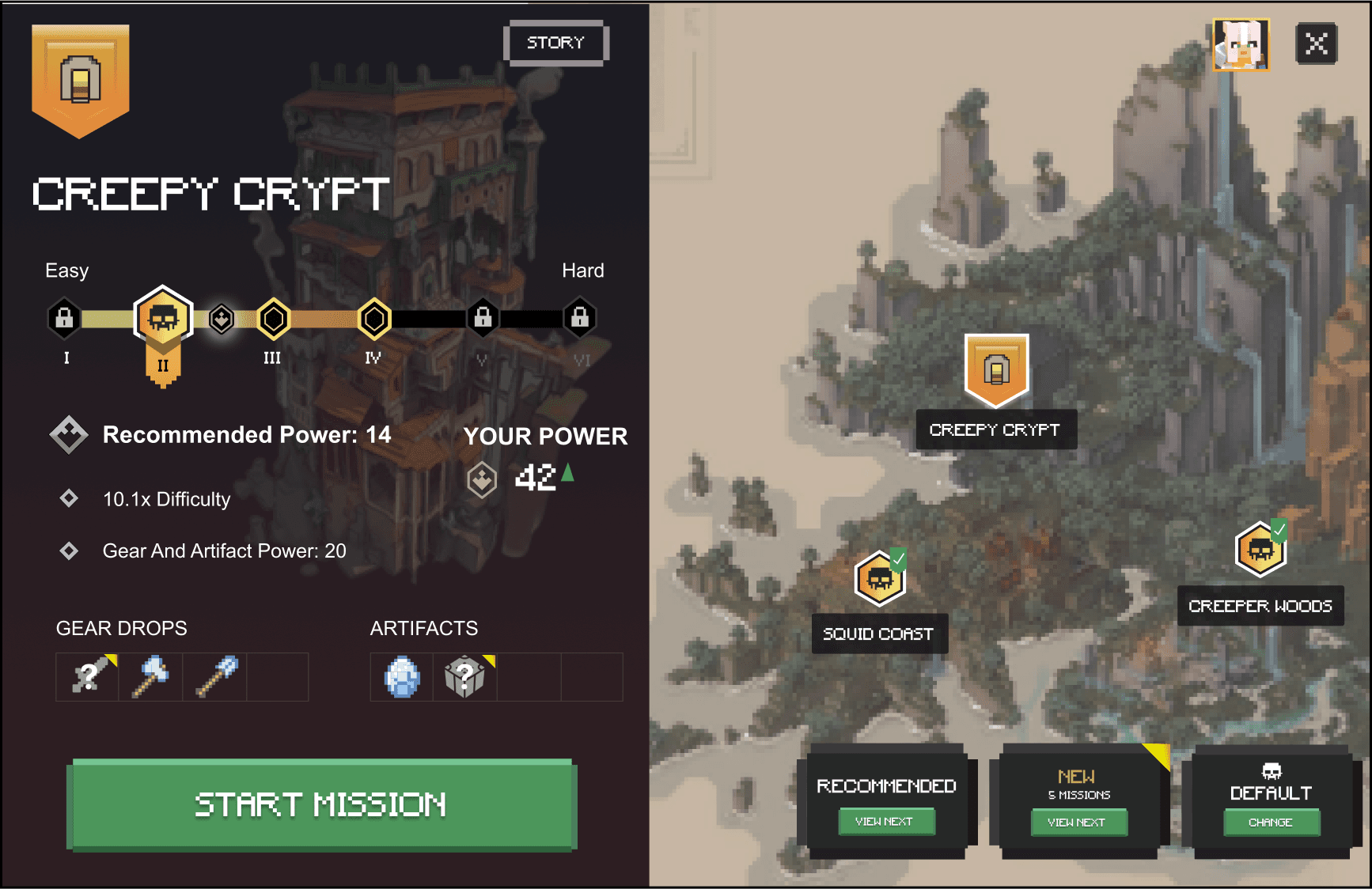 Location / Difficulty: Adding a "Recommended" button that preselects location and adjusts difficulty based on the player's current power level. This helps returning or lost players jump into a challenging experience tailored for them.