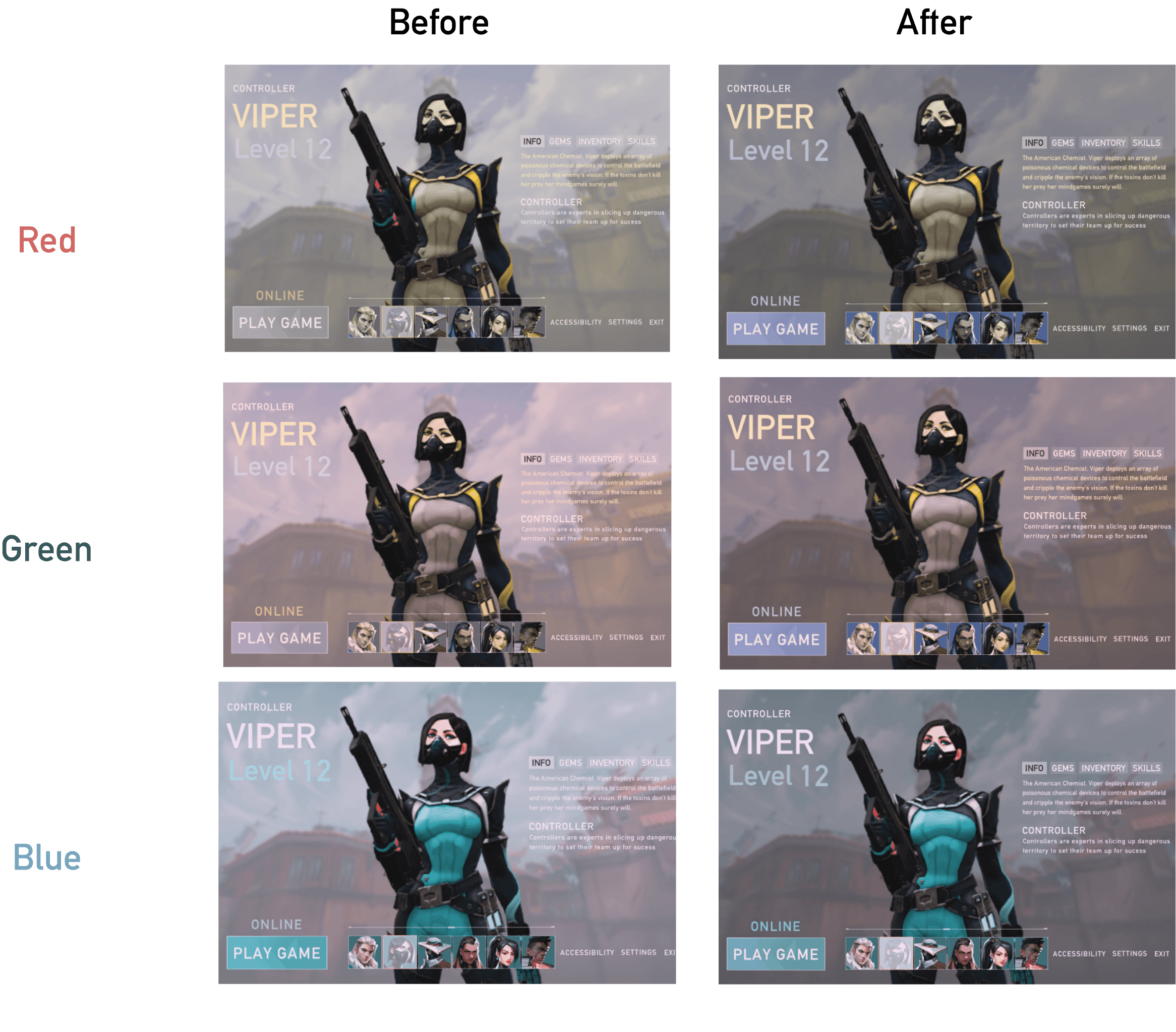 Accessibility: Designed final UI that meets accessibility standards (passing colourblind contrast checks) while maintaining the Valorant style.