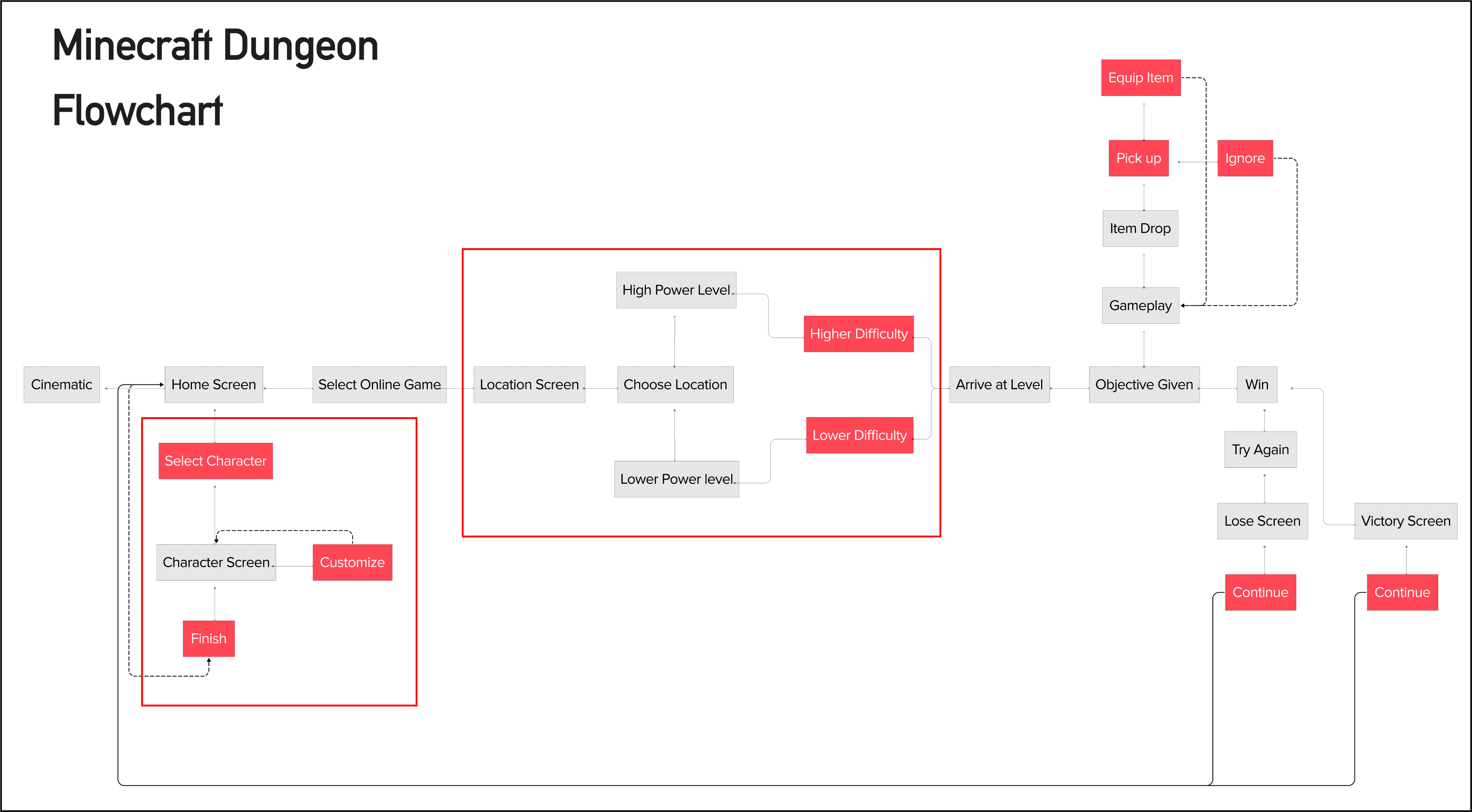 Using the paper prototype as a base, I expanded into a flowchart . This map served as the blueprint for where I should be streamlining the player experience, identifying areas where navigation could be improved.