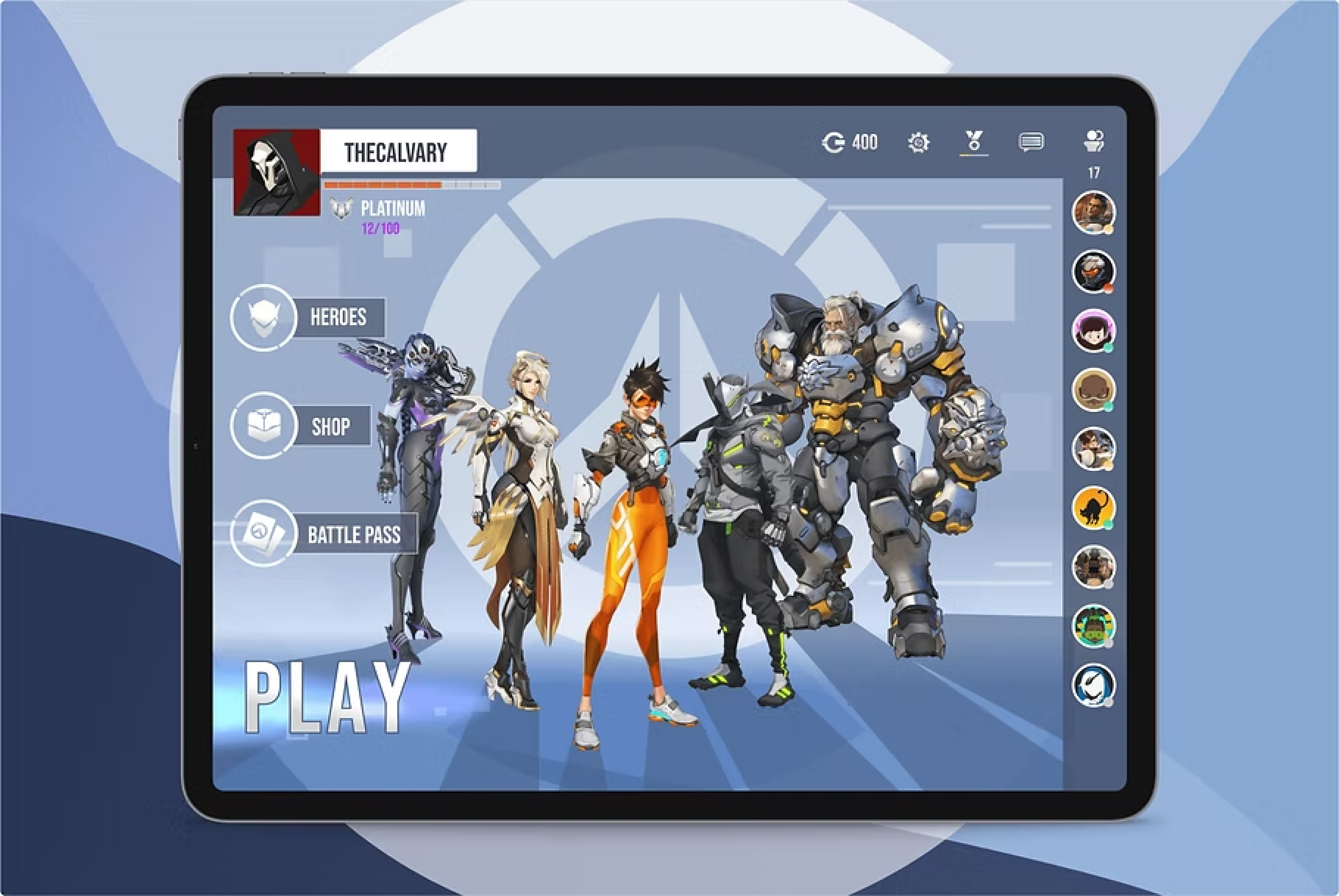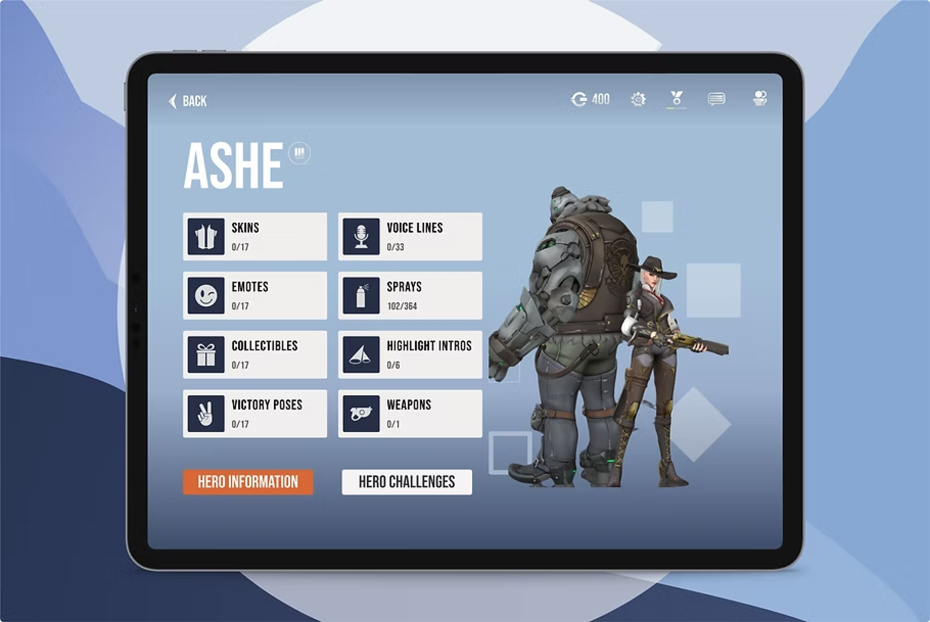 How can features of the Overwatch desktop UI be adapted for tablet touchscreens? The design must retain overall game aesthetics and minimize information overload to player’s familiarity and engagement.